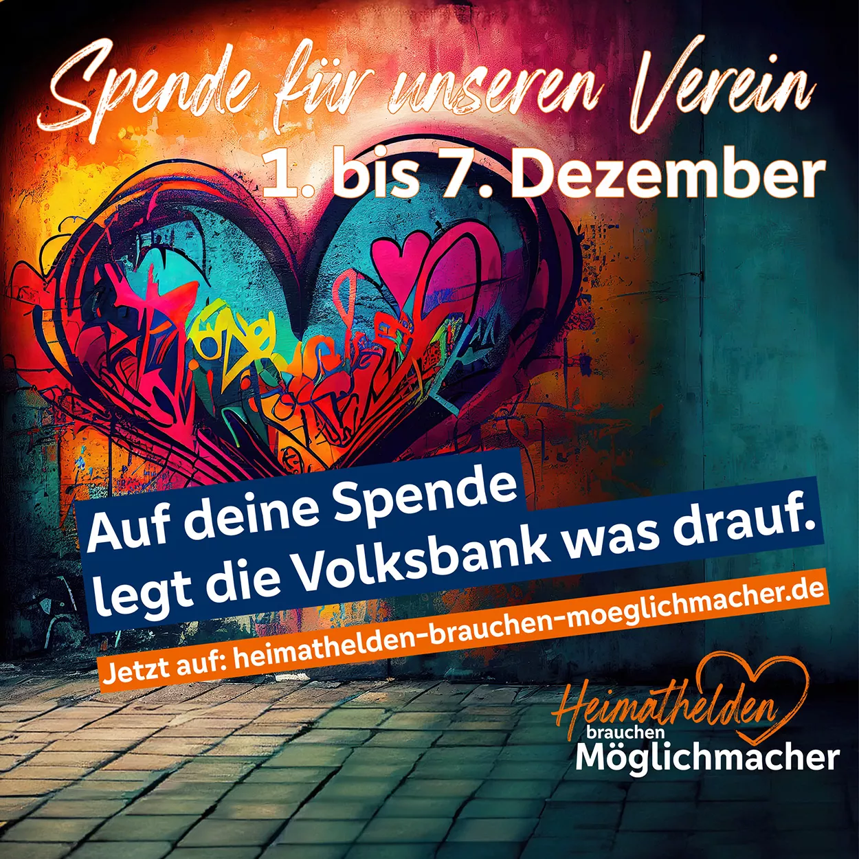 Auch diesmal lohnt sich jede Spende für euren Lieblingsverein wieder besonders, denn am Ende legt die Volksbank noch kräftig was obendrauf! Alle privaten Spenden in diesem Zeitraum werden addiert. Alle Projekte erhalten entsprechend ihres Anteils am gesamten Spendenvolumen einen prozentualen Anteil aus dem Aktionsbudget von 75.000,- € der Volksbank